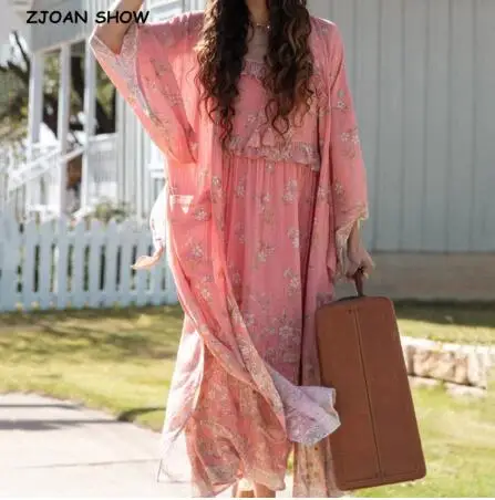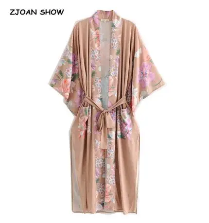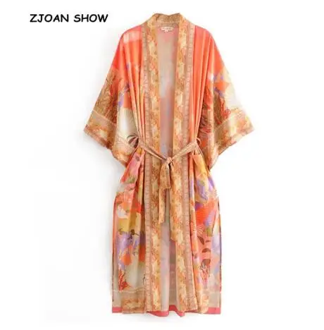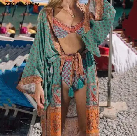 2019 bohème col en V paon fleur imprimé Long Kimono chemise ethnique nouveau laçage up ceintures Long Cardigan lâche Blouse hauts femme
